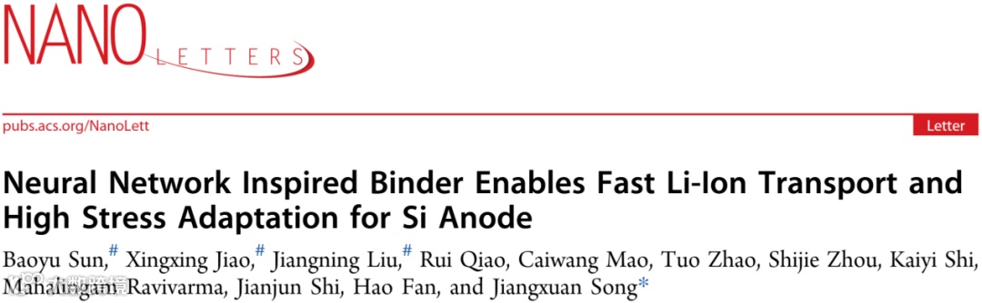 近日,来自西安交通大学的宋江选教授团队在国际知名期刊Nano Letters上发表题为“Neural Network Inspired Binder Enables Fast Li-Ion Transport and High Stress Adaptation for Si Anode”的研究文章。基于有机分子骨架的电子“分布可调”、结构“丰富多变”、力学“刚柔并济”等独有设计优势,创新性地提出了兼具“离子输运-应力耗散”多功能一体化粘结剂分子设计理念。利用应力耗散骨架缓冲硅负极的大体积变化,保障电极的结构稳定性;通过具有孤对电子的醚氧基链段和胺基基团增强厚电极的离子传导能力,提升电极的倍率性能;进一步采用相场模拟揭示功能粘结剂调变硅电极中锂离子的迁移机理。上述研究不仅揭示了有机分子活性单元、构型结构及荷电分布对离子输运、电化学稳定性的影响规律,并阐明了分子间弱相互作用与电极结构应力耗散之间作用机制,为新一代高比能长寿命电池开发提供了新思路。