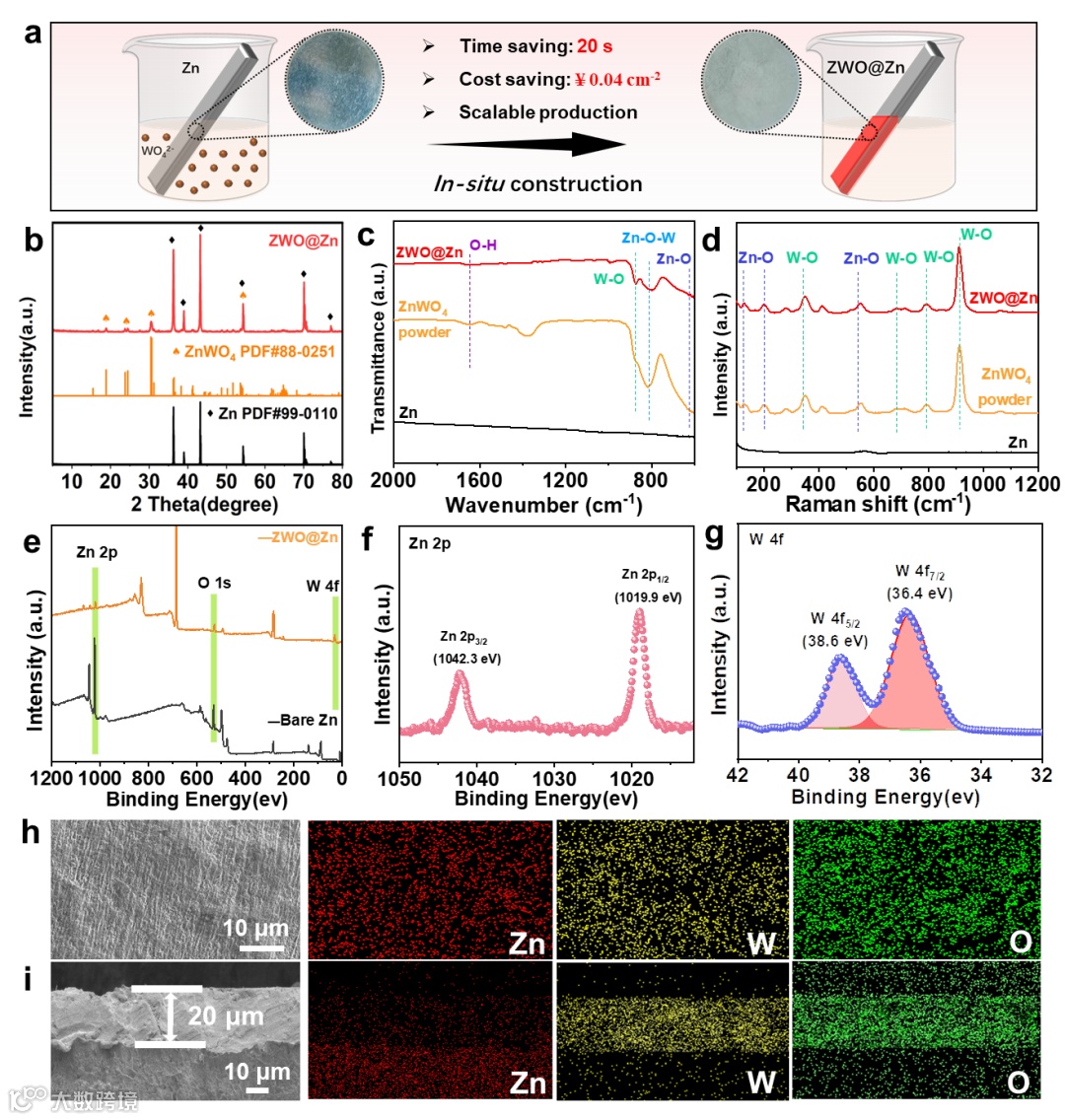 Figure 2 (a) In-situ preparation process of ZWO@Zn anode. (b) XRD, (c) FTIR, (d) Raman, (e) XPS survey of ZWO@Zn and Zn. (f) Zn 2p and (g) W 4f XPS spectra of ZWO@Zn. (h) SEM, and (i) elemental mapping images of ZWO@Zn. (j) Cross section, and (i) elemental mapping images of ZWO@Zn.