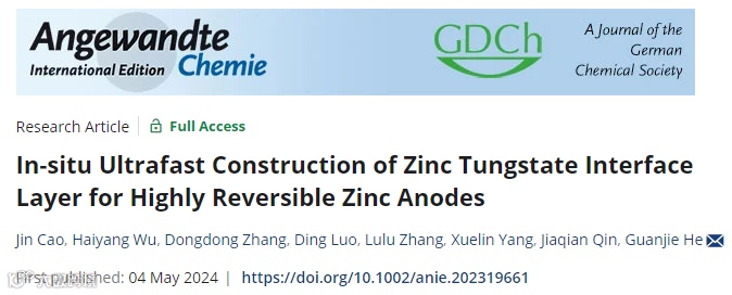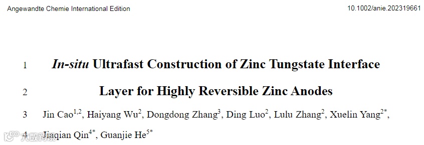 Jin Cao, Haiyang Wu, Dongdong Zhang, Ding Luo, Lulu Zhang, Xuelin Yang, Jiaqian Qin, Guanjie He, In-situ Ultrafast Construction of Zinc Tungstate Interface Layer for Highly Reversible Zinc Anodes, Angewandte Chemie International Edition (2024).