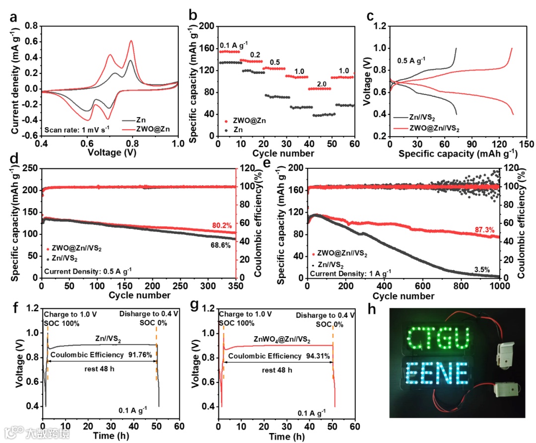 Figure 5 (a) CV curves, (b) rate capacities of Zn||VS2 and ZWO@Zn||VS2full batteries. (c) Charge/discharge curve of Zn//VS2and ZWO@Zn||VS2full batteries 0.5 A g-1. Cycling performance of Zn||VS2and ZWO@Zn||VS2full batteries at (d) 0.5 A g-1 and (e) 1.0 A g-1. Capacity retention curves of (f) Zn||VS2and (g) ZWO@Zn||VS2full batteries. (h) LED illuminated by ZWO@Zn||VS2full batteries.