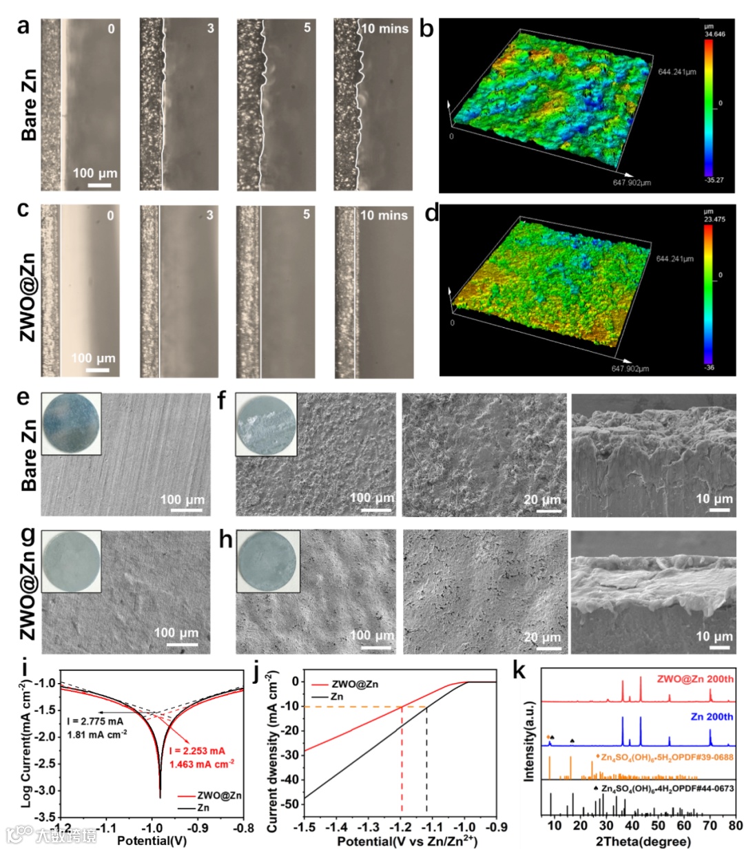 Figure 4 In-situ optical microscopic observations on (a) bare Zn and (c) ZWO@Zn anodes. LCM image of (c) bare Zn and (d) ZWO@Zn anodes. SEM images of (e) bare Zn and (g) ZWO@Zn anodes before cycling. SEM images of (f) bare Zn and (h) ZWO@Zn anodes after cycling. (i) Tafel curves, (j) LSV curves of bare Zn and ZWO@Zn electrodes. (k) XRD patterns of bare Zn and ZWO@Zn anodes after cycling.