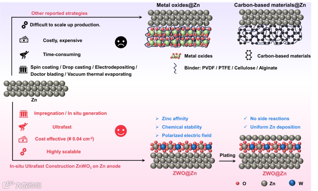 ZWO功能层是原位生长在锌金属表面上的,且反应过程仅需20秒,较先前旋涂法、电镀法、滴铸法制备的涂层,其制备工艺简单、制备快速、成本较低、易于规模化拓展。