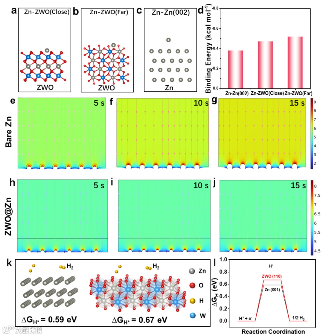 Figure 1 The adsorption model of Zn2+ at different adsorption sites on (a) close position of ZWO, (b) far position of ZWO, and (c) Zn (002). (d) The corresponding binding energy. Electric field simulation on (e-g) bare Zn and (h-j) ZWO@Zn anodes. (k), (l) Gibbs free energy diagram for HER on Zn (001) and ZWO (110).