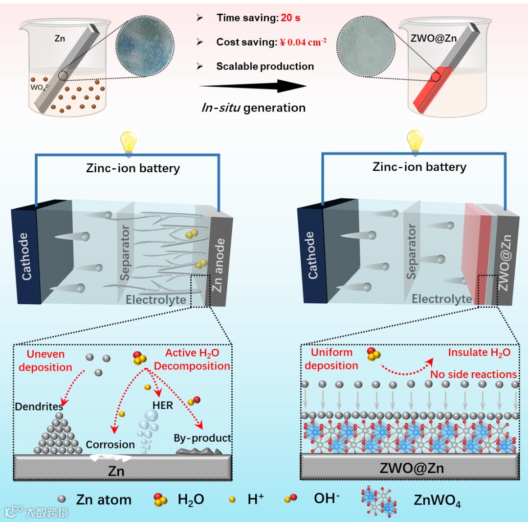 近日,来自三峡大学曹金副教授、杨学林教授联合朱拉隆功大学秦家千研究员和伦敦大学学院何冠杰教授,在国际知名期刊Angewandte Chemie International Edition上发表题为“In-situ Ultrafast Construction of Zinc Tungstate Interface Layer for Highly Reversible Zinc Anodes”的研究论文。该观点文章通过简单快速的20秒溶液相反应,在锌金属表面原位构建了一层亲锌的ZnWO4层。通过ZnWO4对负极界面电场以及锌离子扩散行为的调控,抑制枝晶和界面副反应,实现高度可逆的锌金属负极。使用ZnWO4@Zn(ZWO@Zn)电极组装的对称电池中,在1mA cm-2条件下能够稳定循环1800小时,10 mA cm-2条件下稳定循环1200小时。并且能够显著提高锌金属负极的库伦效率和全电池的电化学性能。