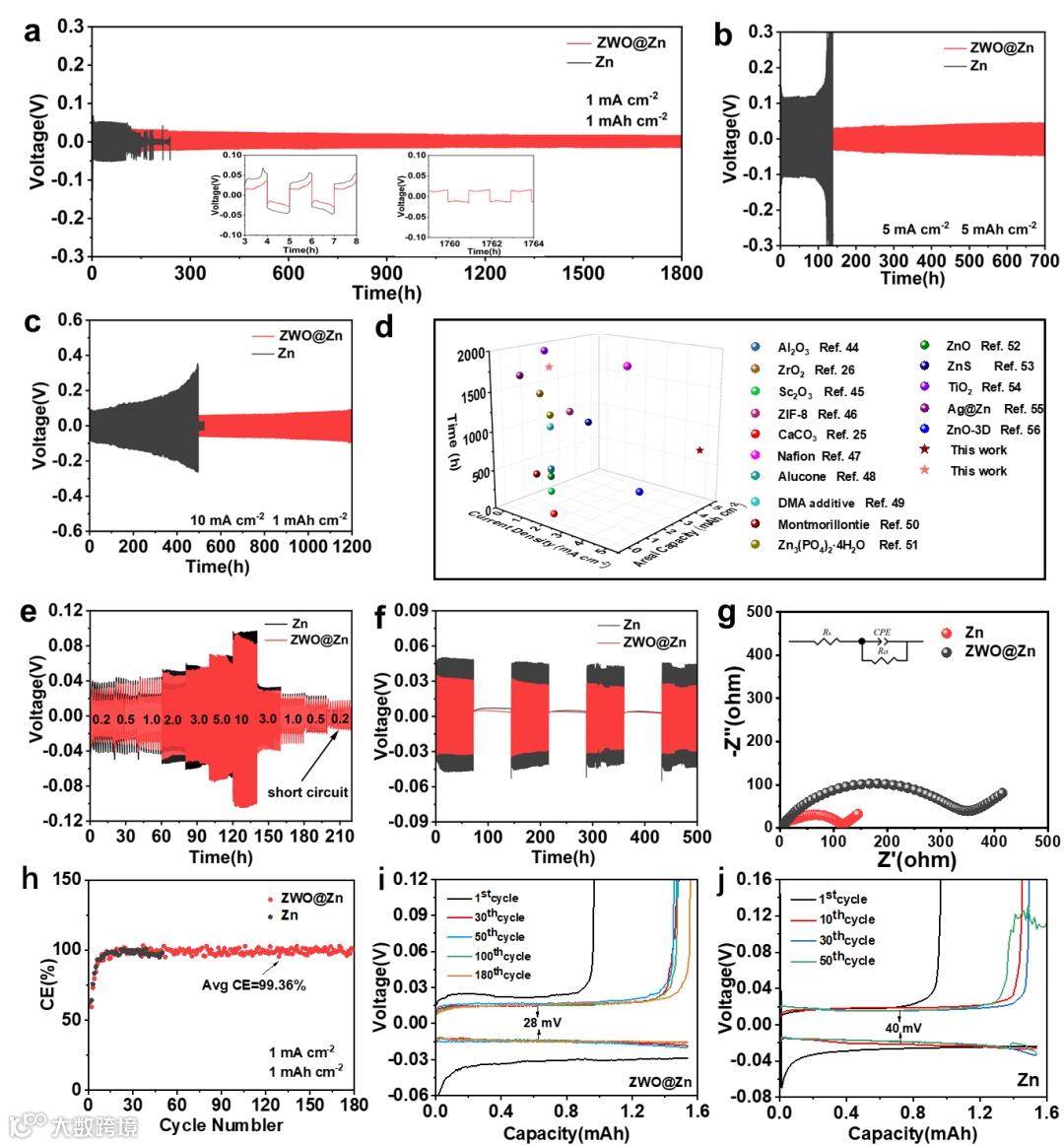 ZWO功能层具有较强亲锌性,能够提供大量的锌沉积位点,并促进锌离子的三维扩散,最终抑制锌枝晶的形成。ZWO功能层能够调控界面电场分布,并且隔绝水分子对锌金属负极的侵蚀,最终抑制析氢、腐蚀和副产物等界面副反应。