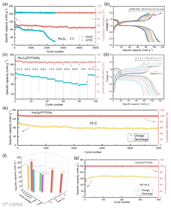 上述这些有利的电化学特性为PDTE的多功能性和应用多样性提供了额外的证据,进一步支持了其在实际应用中的潜力。尤其与Mo6S8正极相匹配时,展现出超长循环寿命和高倍率性能(图4)。