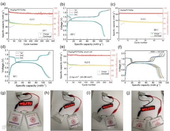图6. Mo6S8||PDTE||Mg扣式电池在a)-20°C和c)50°C下在0.2 C下循环的性能;b,d)初始三次循环的相应电压曲线。e)Mo6S8||PDTE||Mg软包电池在0.2 C下的室温循环性能,f)相应的电压曲线。不同状态下软包电池点亮灯牌的数码照片,g)两个串联的完整Mo6S8||PDTE||Mg软包电池;其中一个折叠h)90°,i)180°,j)两个被从中间切断后的软包电池