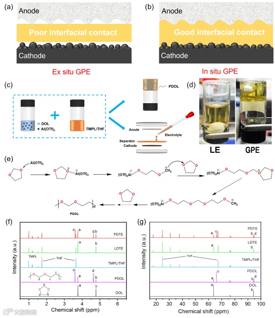 图1. PDTE的制备工艺、聚合机理及表征。a)界面接触不良的非原位GPE 电池和 b)界面接触良好的原位 GPE 电池的示意图。c)PDTE原位制备过程示意图。d)液体LDTE(左)和凝胶PDTE(右)的数码照片。e)Al(OTf)3引发 DOL 开环聚合的机理示意图。PDTE、LDTE、TMPL/THF、PDOL 和 DOL 的f)1H 和 G)13C NMR谱图1f, g结合拉曼光谱(Raman)、傅里叶变换红外光谱(FTIR)验证了凝胶电解质中PDOL的形成。