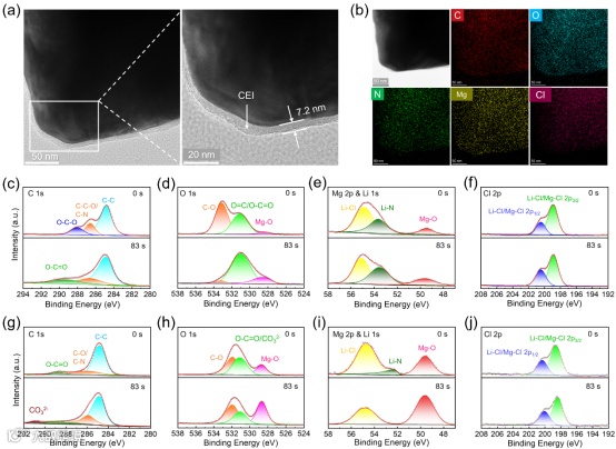 图5. 循环后Mo6S8颗粒表面CEI层的特性。a)在 PDTE 中以 0.2 C 的速率循环20次后Mo6S8电极颗粒表面的透射电镜(TEM)图像和 b)CEI层的相应EDS元素映射。在 PDTE(c–f)和 LDTE(g–j)中循环的Mo6S8电极表面CEI层深度XPS光谱分析,c,g)C1s;d,h)O1s;e,i)Mg 2p;f,j)Cl 2p