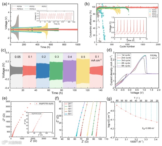 综合对称电池和不对称电池性能,以及EIS等电化学特征(图2),表明PDTE具有良好的Mg负极兼容性和较高的离子电导率(室温下为2.8×10-4 S cm-1),Mg沉积/溶出效率2000次循环保持在98.9%。