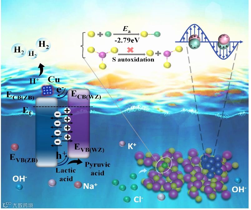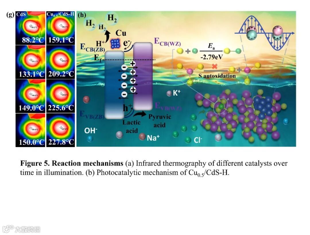 使用红外热成像仪测量了合成光催化剂的表面温度,Cu0.5/CdS-H 的表面温度明显高于原始 CdS 的表面温度且随着铜沉积量的增加而升高,表明Cu NCs 具有光热驱动催化加速反应动力学的潜力。与原始 CdS 相比,由于引入了 Cu NCs,Cu0.5/CdS-H 表现出更强的活性氢吸附能力。在反应后 Cu0.5/CdS-H 的 XPS 勘测中检测到了 Cl 被固定在催化剂上的证据,164.1eV 位置对应于 S-Cl 键,这有利于抑制 CdS 的光腐蚀,同时阻碍 Cl- 对催化剂的氧化腐蚀。同质结费米能级不同,在交替相界面上形成了弯曲能带和内部静电场。在可见光照射下,光生电子从价带(VB)转移到交错 CdS-H 的导带(CB)。在内部静电场的驱动下,WZ-CdS-H 的 CB 上的光生电子迁移到 ZB-CdS-H 的 CB 上,而 ZB-CdS-H 的 VB 上的光生空穴则迁移到 WZ-CdS-H 的 VB 上。ZB-CdS-H 中边缘连接的不饱和 S 原子与适量的 Cu 原子形成 Cu-S 键,成为电子传输通道。Cu NCs 既是光生电子的捕获点,也是 *H 物种的吸附点,可将 *H 物种还原为H2。光热效应加速了系统中的反应动力学,促使电子更定向地从 CdS-H 迁移到 Cu NCs。