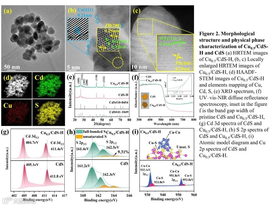 Figure 2. Morphological structure and physical phase characterization of Cu0.5/CdS-H and CdS (a) HRTEM images of Cu0.5/CdS-H, (b, c) Locally enlarged HRTEM images of Cu0.5/CdS-H, (d) HAADF-STEM images of Cu0.5/CdS-H and elements mapping of Cu, Cd, S, (e) XRD spectrum, (f) UV–vis-NIR diffuse reflectance spectroscopy, inset in the figure f is the band gap width of pristine CdS and Cu0.5/CdS-H, (g) Cd 3d spectra of CdS and Cu0.5/CdS-H, (h) S 2p spectra of CdS and Cu0.5/CdS-H, (i) Atomic model diagram and Cu 2p spectra of CdS and Cu0.5/CdS-H.