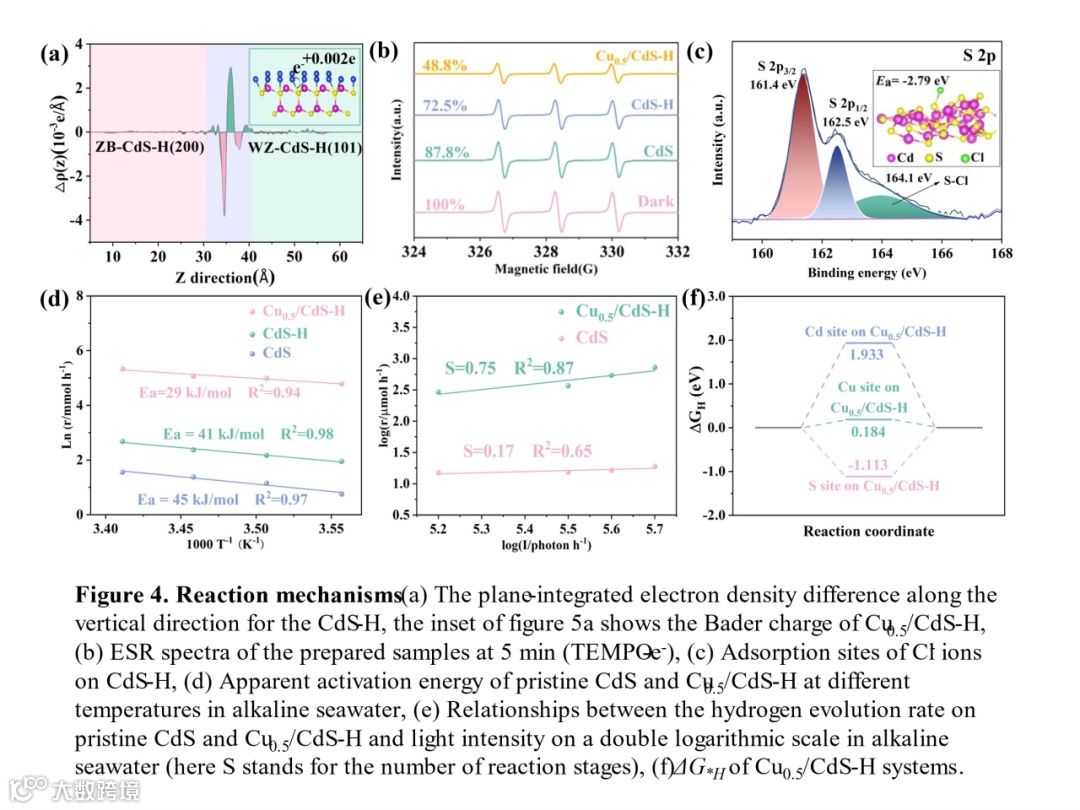 Figure 4. Reaction mechanisms (a) The plane-integrated electron density difference along the vertical direction for the CdS-H, the inset of figure 5a shows the Bader charge of Cu0.5/CdS-H, (b) ESR spectra of the prepared samples at 5 min (TEMPO-e-), (c) XPS spectra of S 2p after the reaction, inset shows the Adsorption sites of Cl- ions on CdS-H (d) Apparent activation energy of pristine CdS, CdS-H and Cu0.5/CdS-H at different temperatures in alkaline seawater, (e) Relationships between the hydrogen evolution rate on pristine CdS and Cu0.5/CdS-H and light intensity on a double logarithmic scale in alkaline seawater (here S stands for the number of reaction stages), (f) ΔG*H of Cu0.5/CdS-H systems, (g) Infrared thermography of different catalysts over time in illumination. (h) Photocatalytic mechanism of Cu0.5/CdS-H.