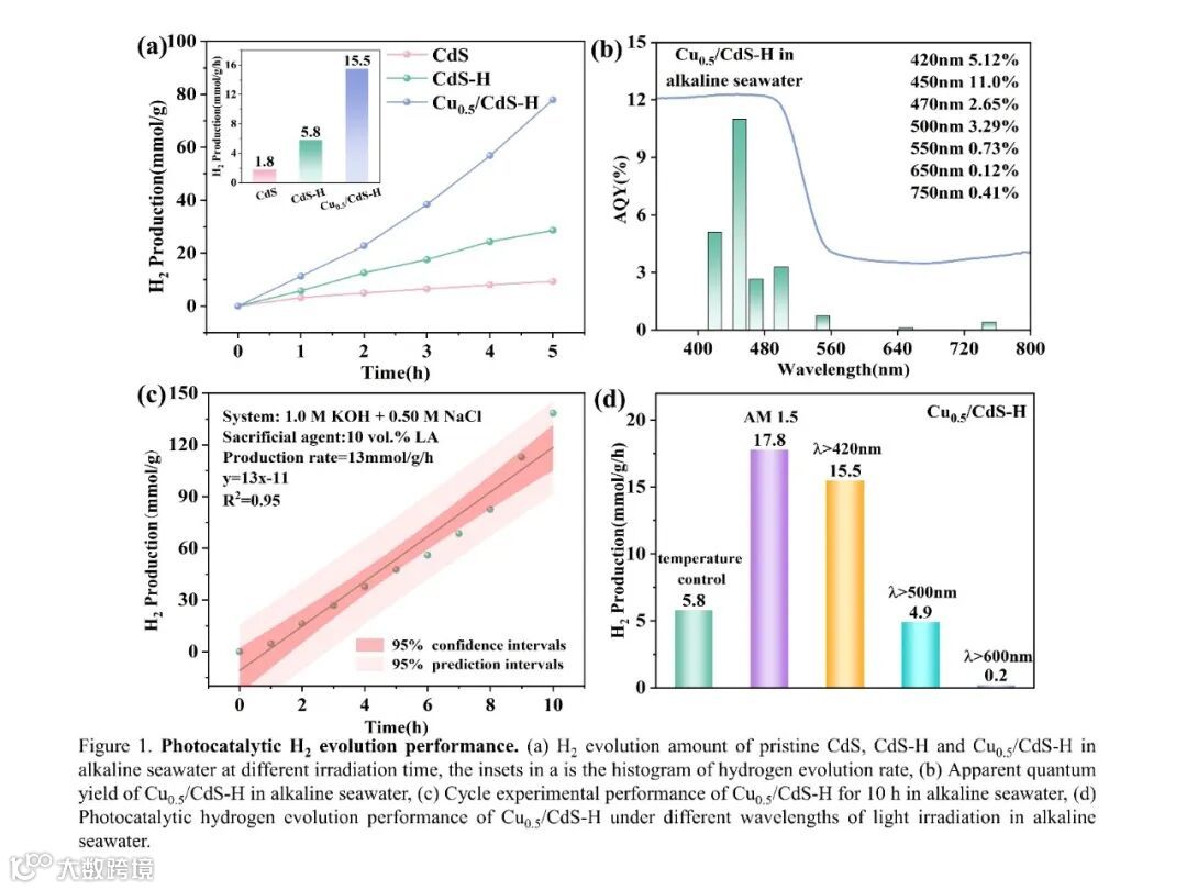 通过对原始 CdS 和 Cu0.5/CdS-H 在碱性海水中的光催化氢进化进行系统评估来突出材料设计的优越性。与原始 CdS 相比,CdS-H 在碱性海水(1.0 M KOH 和 0.5 M NaCl)中表现出更高的光催化析氢效率(5.8 mmol/g/h),这归因于同质结中费米能级的差导致电子-空穴对的有效分离。Cu0.5/CdS-H在碱性海水中的光催化析氢速率比原始CdS显著提高了约9.0倍,优于大多数已报道的光催化剂。Cu0.5/CdS-H的表观量子产率(AQY)与其紫外-可见吸收光谱非常吻合,表明在碱性海水中Cu0.5/CdS-H的析氢反应是光驱动过程。