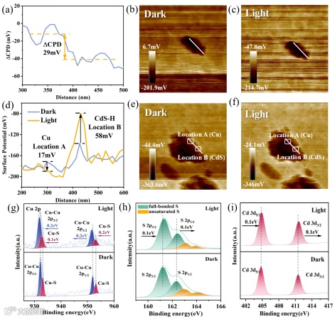 Figure 3. Directed migration of photocarriers in Cu0.5/CdS-H (a) Contact potential difference of CdS-H subtracting the potential under darkness from that under irradiation, the surface photovoltage distribution of CdS-H under darkness (b) and visible-light irradiation conditions (c), (d) Surface photovoltage of Cu0.5/CdS-H under darkness and visible light irradiation, surface photovoltage distribution of Cu0.5/CdS-H under darkness (e) and visible-light irradiation conditions (f), (ΔCPD = CPDlight - CPDdark), In situ XPS spectra of pristine CdS and Cu0.5/CdS-H: (g) Cu 2p, (h) S 2p, (i) Cd 3d.