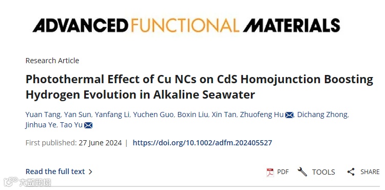 参考文献:Y. Tang, Y. Sun, Y. F. Li, Y. C. Guo, B. X. Liu, X. Tan, Z. F. Hu, D. C. Zhong, J. H. Ye, and T. Yu*, Photothermal Effect of Cu NCs on CdS Homojunction Boosting Hydrogen Evolution in Alkaline Seawater. Adv. Funct. Mater. 2024, 2405527.