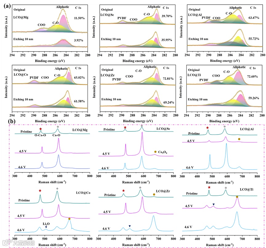 图 5. (a) LCO@X 经过 200 次循环后表面 C 1s 的 XPS 溅射光谱。(b) 在原始电压(3.0 V)、4.5 V 和 4.6 V ,50 个周期后 LCO@X的拉曼测量。