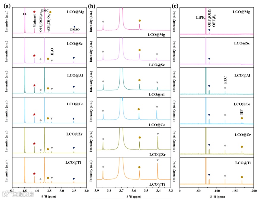 图 4. (a) LCO@X电池的电解液在 DMSO-d6 溶剂中的 1H NMR 信号。(b) 放大的 1H NMR 信号。(c) 从 LCO@X 电池中提取的电解质在 DMSO-d6 溶剂中的 19F NMR 信号。