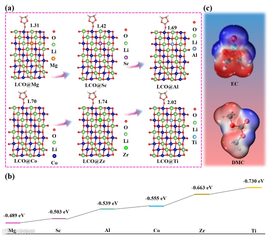利用密度泛函理论(DFT)计算了不同电负性的 LCO@X(X = Mg、Sc、Al、Co、Zr、Ti) 与EC之间的相互作用力。结果表明,随着元素电负性的增加,LCO@X 与 EC 之间的界面吸附能逐渐增强,较高的吸附力可促使更多的 EC 包裹在界面周围,从而增强亲核攻击和氧化的强度。最终导致电解质分解加速,电化学性能恶化。