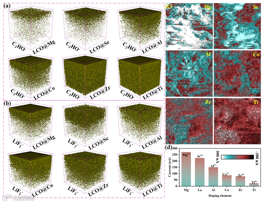 使用 TOP-SIMS 和具有导电模式的原子力显微镜(c-AFM)测试有机成分的厚度和界面的导电性。在 LCO@X 的界面上,C2HO- 有机成分的厚度随着电负性上升而逐渐增加。这表明,界面吸附能越强,电解质分解行为越严重。同时,LiF2- 的片段在 LCO@X 界面上表现出与 C2HO- 相同的趋势。这可能是因为 LCO@X 界面的吸附力增强,在充放电过程中,更多的导电分子可能会夹带界面处的 LiPF6,从而加速 LiPF6在 LCO@X 界面上催化分解为 LiF 和 HF 的行为。