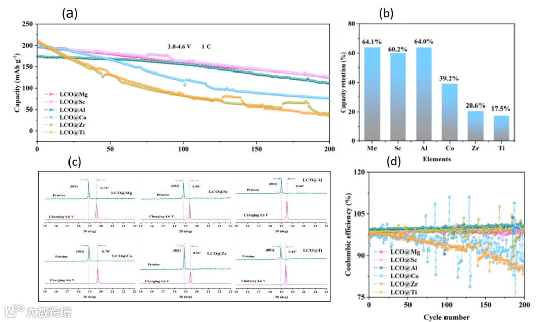 图 3. (a) LCO@X 在 1C 下 3.0-4.6 V 长循环。(b) LCO@X 在循环过程中的容量保持率。(c) LCO@X 充电过程中(3.0-4.6 V)原位XRD。(d) LCO@X 在循环过程中的库伦效率。