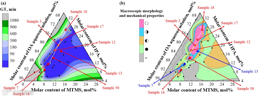 图3 三元等高线分布图:(a) 凝胶时间;(b) MSQ气凝胶隔热片的宏观形态和机械性能。备注:GT = 凝胶时间。-:MTMS溶胶不能在48小时内发生凝胶化;●:质地致密或柔软、易掉粉的乳白色气凝胶;◐:质地致密或不掉粉的透明气凝胶;◑:质地硬、轻、不掉粉的乳白色气凝胶;○:质地软、轻、不掉粉的乳白色气凝胶。