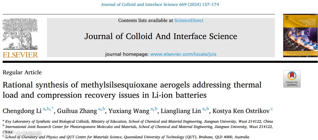 近日,来自江南大学的李承东副研究员与昆士兰科技大学的Kostya Ken Ostrikov教授合作,基于锂离子电池在服役中存在热过载和压缩应力,易引起燃烧和机械故障的安全性问题提出了解决方案,在国际知名期刊《Journal of Colloid and Interface Science》上发表题为“Rational synthesis of methylsilsesquioxane aerogels addressing thermal load and compression recovery issues in Li-ion batteries”的研究论文。纤维纸在反复承受高应变压缩载荷后难以恢复至初始厚度,因此提高气凝胶隔热片弹性的关键在于增加气凝胶的弹性,而这与气凝胶颗粒的尺寸和三维排列有很大关联。二氧化硅气凝胶的微观结构是通过硅前驱体的水解和缩合反应(即溶胶-凝胶过程)形成的。合成条件,尤其是溶胶成分,会影响胶体颗粒的生长动力学,从而影响二氧化硅气凝胶的微观结构和性能。现有文献虽然已报道不同硅源复合、共聚、硅烷与聚合物共凝胶等多种策略来提高二氧化硅气凝胶的机械性能。但是,只有少数文献深入地研究了溶胶成分对由单一硅源制成的气凝胶隔热片的微观结构和机械性能的影响。