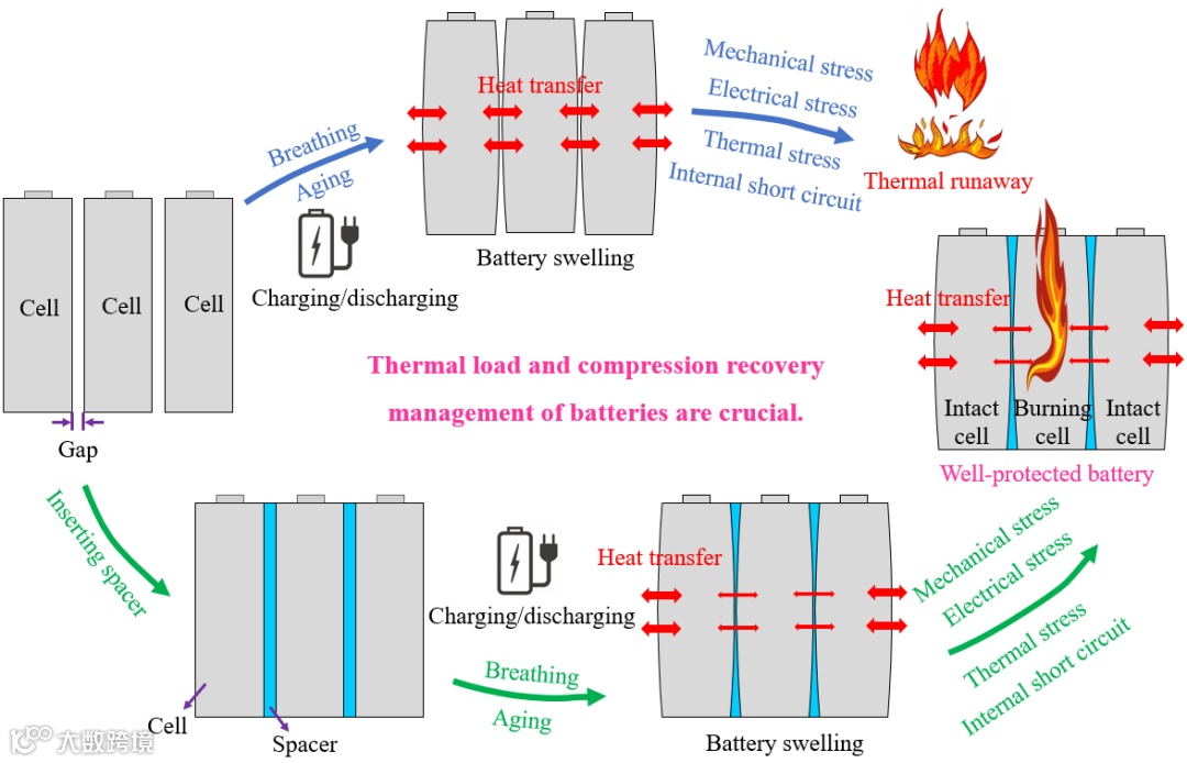 作为清洁的可再生能源,锂离子电池具有高能量密度、高功率密度、高电压、循环寿命长和环保等优势,近年来已被广泛应用于智能手机、新能源汽车和储能电站等领域。然而,它们是温度依赖型器件,最佳工作温度范围为15-40 °C。过高(>40 °C)或过低(<0 °C)的温度都可能导致电池性能受损,甚至燃烧或爆炸(即电池热失控)。气凝胶隔热片具有优异的绝热和阻燃性能,可有效地降低电池热失控风险,提高电池的安全性和稳定性,并且其轻质和阻燃特性使其能促进电池的轻量化和高性能化,成为解决动力电池系统安全问题的最佳选择。现有技术通常在电池之间插入0.5-5.0毫米厚的气凝胶隔热片(见图1),使电池温度恒定在所需范围内。然而,锂离子电池在充-放电周期中会发生可逆的体积变化,并在长期使用过程中会因老化而变厚,使隔热片被不断地压缩。因此,高压缩弹性、优异的隔热和防火阻燃性能成为新能源汽车电池用气凝胶隔热片的关键性能要求。
