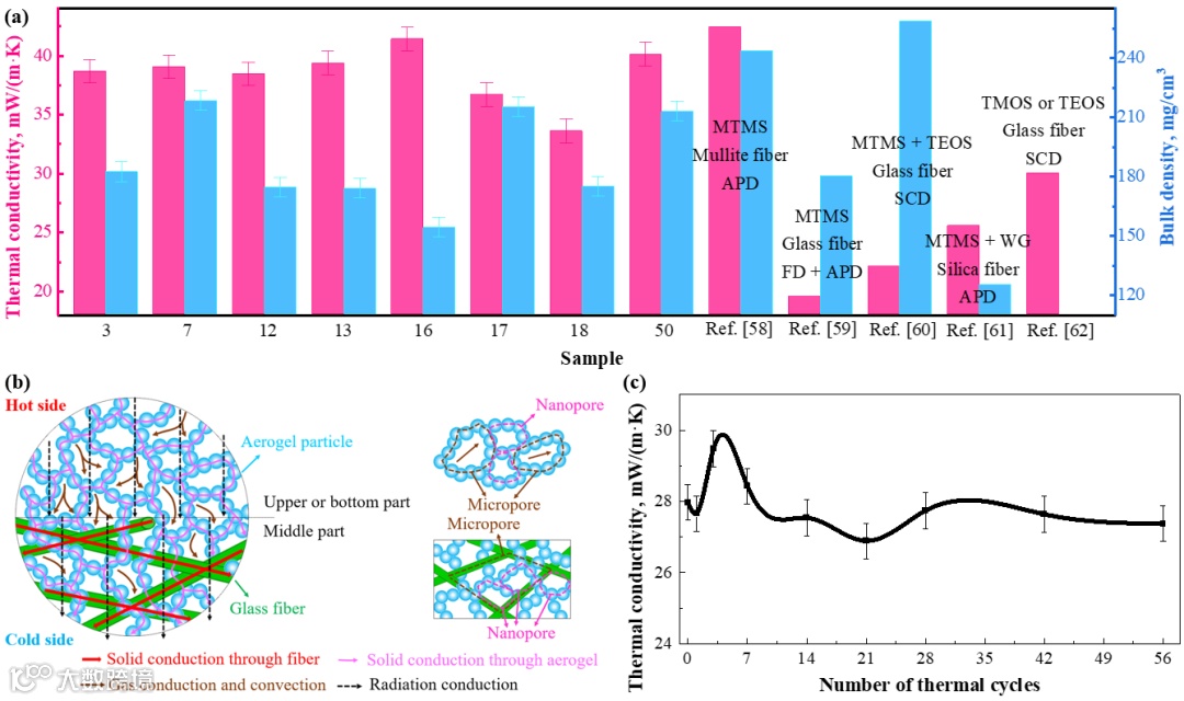 图5 MSQ气凝胶隔热片的(a)热导率和体积密度,(b)热传导机制,(c)样品18的热循环热导率稳定性。备注:MTMS=甲基三甲氧基硅烷,MTES=甲基三乙氧基硅烷,TEOS=正硅酸四乙酯,TMOS=甲基三甲氧基硅烷,WG=水玻璃,APD=常压干燥,SCD=超临界干燥,FD=冷冻干燥。
