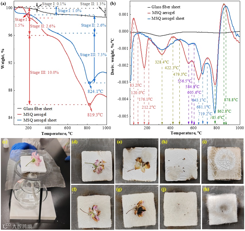 图6 MSQ气凝胶隔热片样品18、玻纤纸和MSQ气凝胶在N2气氛中的(a)TG和(b)DTG曲线。用酒精灯分别在MSQ气凝胶隔热片样品18上燃烧(d)3分钟和(e)5分钟,在玻纤纸上燃烧(f)3分钟或(g)5分钟的鲜花照片。样品18在燃烧5分钟后的(h)上表面和(i)下表面照片。玻纤纸在燃烧5分钟后的(j)上表面和(k)下表面照片。