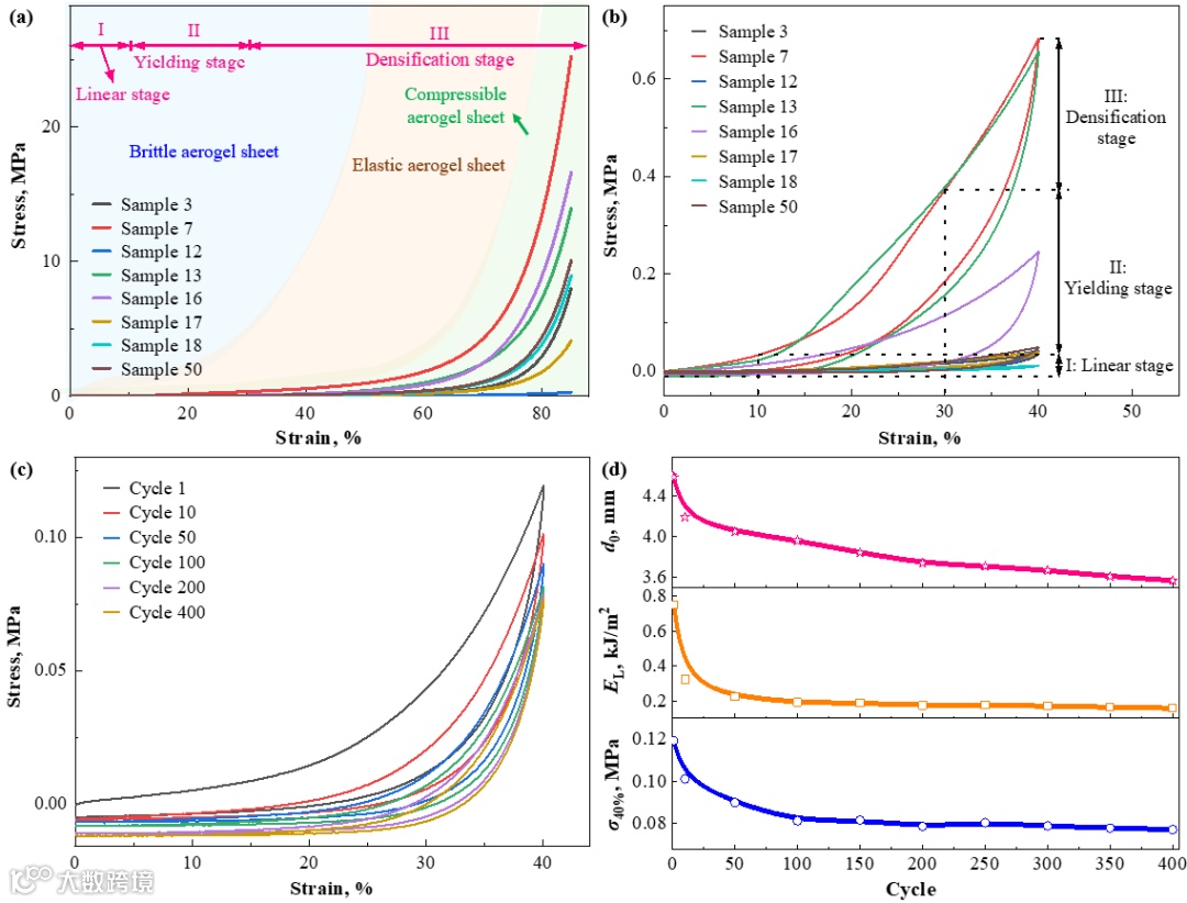 MSQ气凝胶隔热片样品3、7、12、13、16、17、18和50都能承受大于80.0%的压缩应变,依据压缩应力-应变曲线的分类标准,均属于性能最高的压缩型气凝胶。