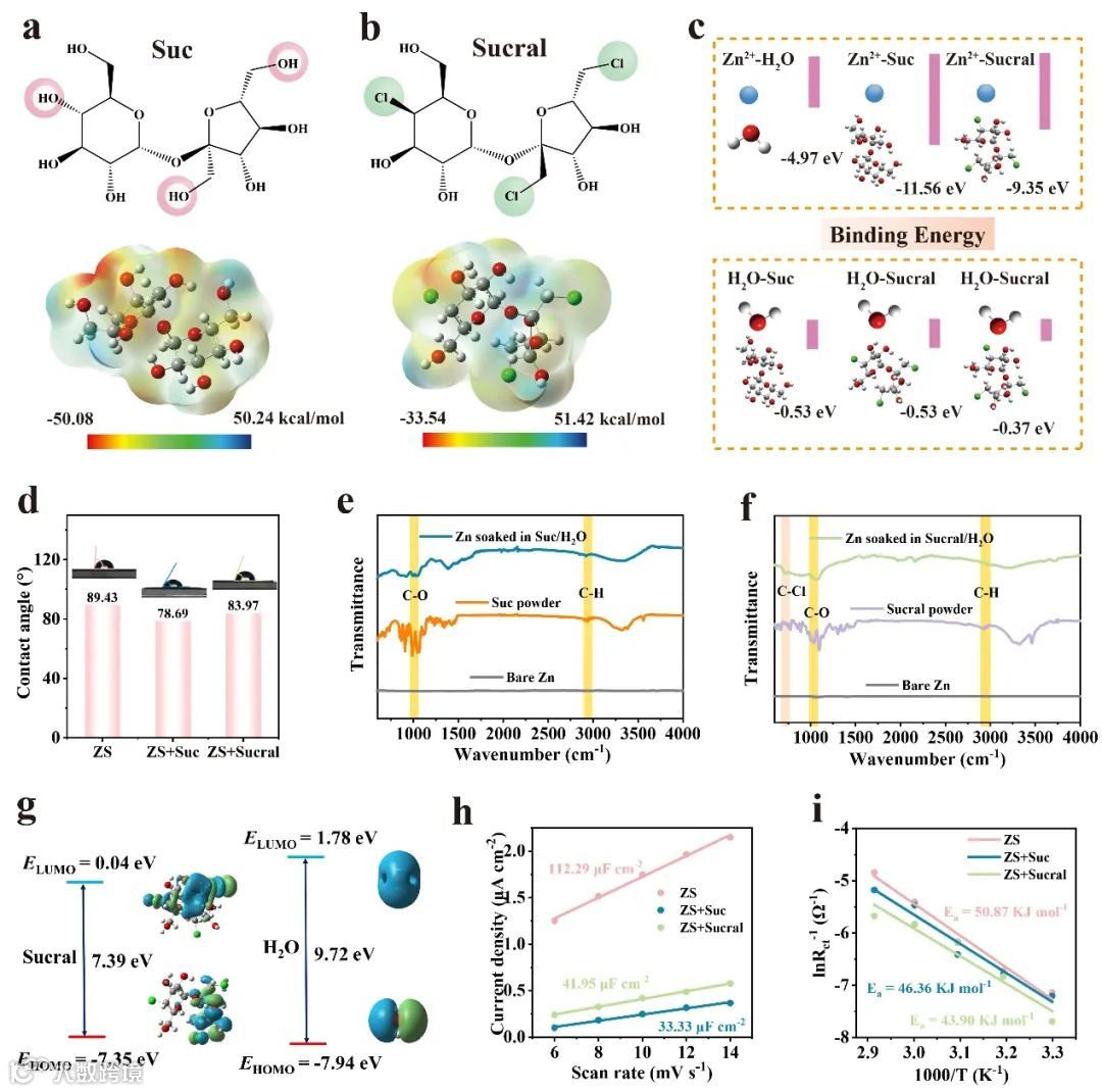 图1 a-b)Suc和Sucral的分子结构和相应的静电势。c)不同物质(H2O、Suc、Sucral和Zn2+)之间的结合能。d)三种电解质在锌阳极上的接触角。浸泡在e)Suc和f)Sucral水溶液中的锌箔的傅立叶变换红外光谱(FTIR)。g)Sucral和H2O的HOMO和LUMO能级。h)三种电解质的EDL测试。i)阿伦尼斯曲线和活化能(Ea)值。