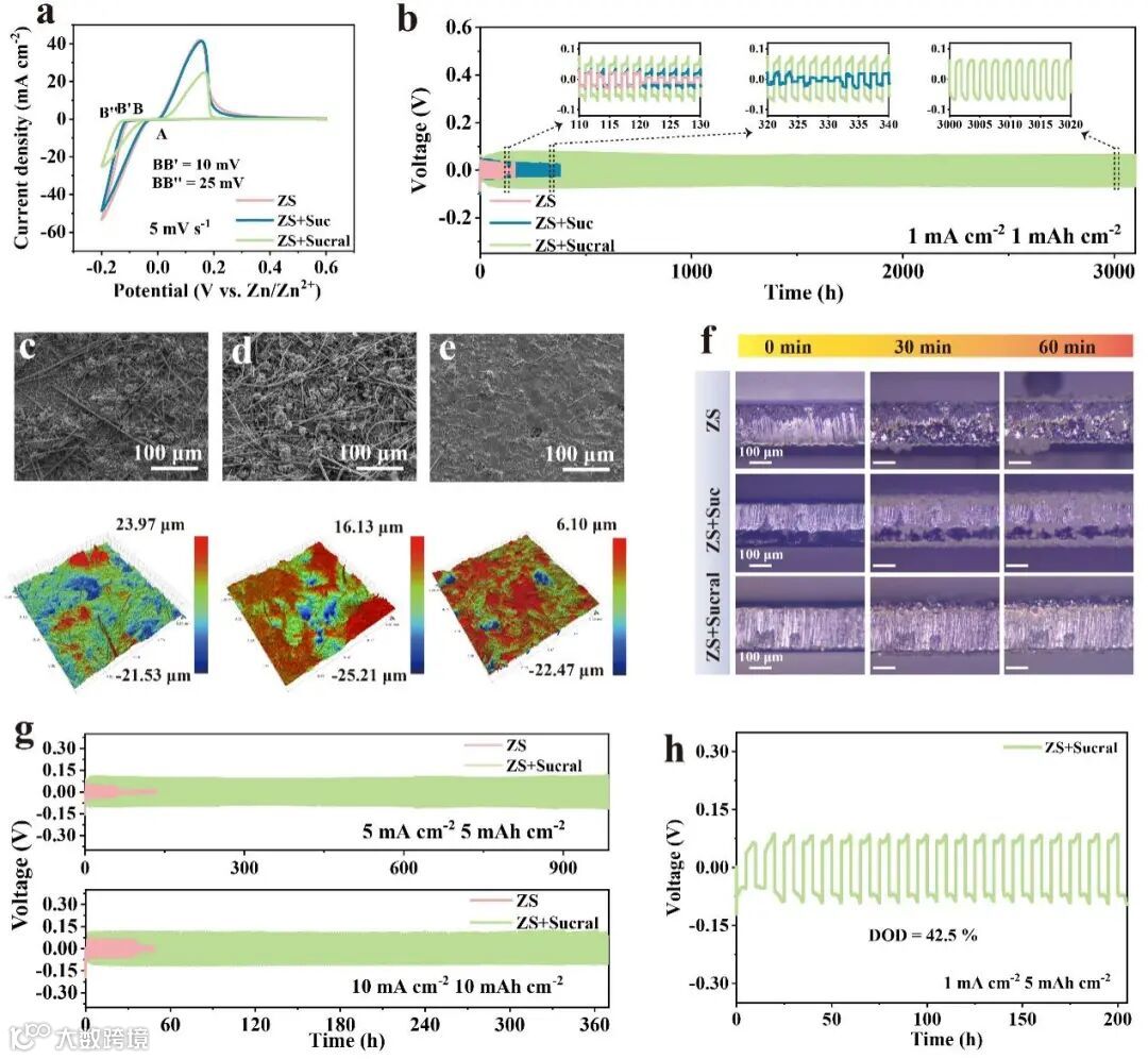 图3 a)Zn//Ti电池在不同电解质中的CV曲线。b)Zn||Zn对称电池在不同电解质中在1 mA cm-2和1 mAh cm-2下的循环性能。在不同电解质中锌负极循环120小时后的SEM图像和表面光学轮廓:c)ZS、d)ZS+Suc和e)ZS+SSucal。f) 这三种电解质中锌沉积过程的原位光学显微镜。Zn||Zn对称电池在不同电解质中的循环性能(g)5 mA cm-2、5 mAh cm-2和10 mA cm-2,10 mAh cm-2,h)1 mA cm-2和5 mAh cm-2(DOD=42.5%)。