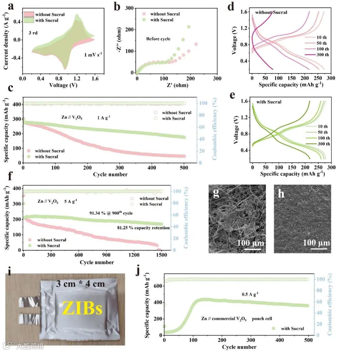 图5 a)Zn//V2O5全电池在不同电解质中的CV曲线。b) 循环前Zn// V2O5全电池的EIS曲线。c-e)Zn// V2O5全电池在1 A g-1不同电解质中的循环性能以及相应的GCD曲线。f-h)Zn// V2O5全电池在不同电解质中在5 A g-1下的循环性能以及循环后的负极SEM。i)Zn// V2O5软包电池的光学图像。j)软包电池的长循环性能。