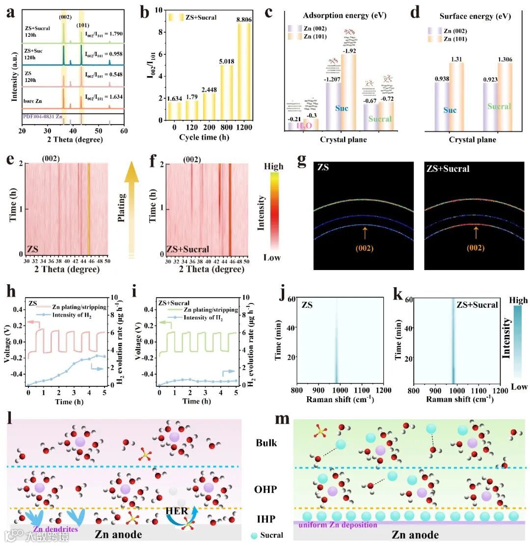 图4 a)循环锌负极的XRD图谱。b)在ZS+Sucral中不同循环时间后I(002)/I(101)的强度比。c) H2O、Suc和Sucral在Zn(002)和(101)平面上的吸附能。d)吸附Suc和Sucral分子后Zn(002)和(101)平面的表面能。e-f)在3 mA cm-2下在不同电解质中镀锌过程的原位XRD图谱。g)Ti箔上Zn镀层的2D掠入射X射线衍射(2D-GIXRD)图。h-i)在5 mA cm-2下由Zn电镀/剥离过程的原位EC-GC电压-时间曲线和H2产生速率。j-k)Zn电镀过程中的原位拉曼图。l)ZS和m)ZS+Sucral电解质中Zn沉积行为的示意图。