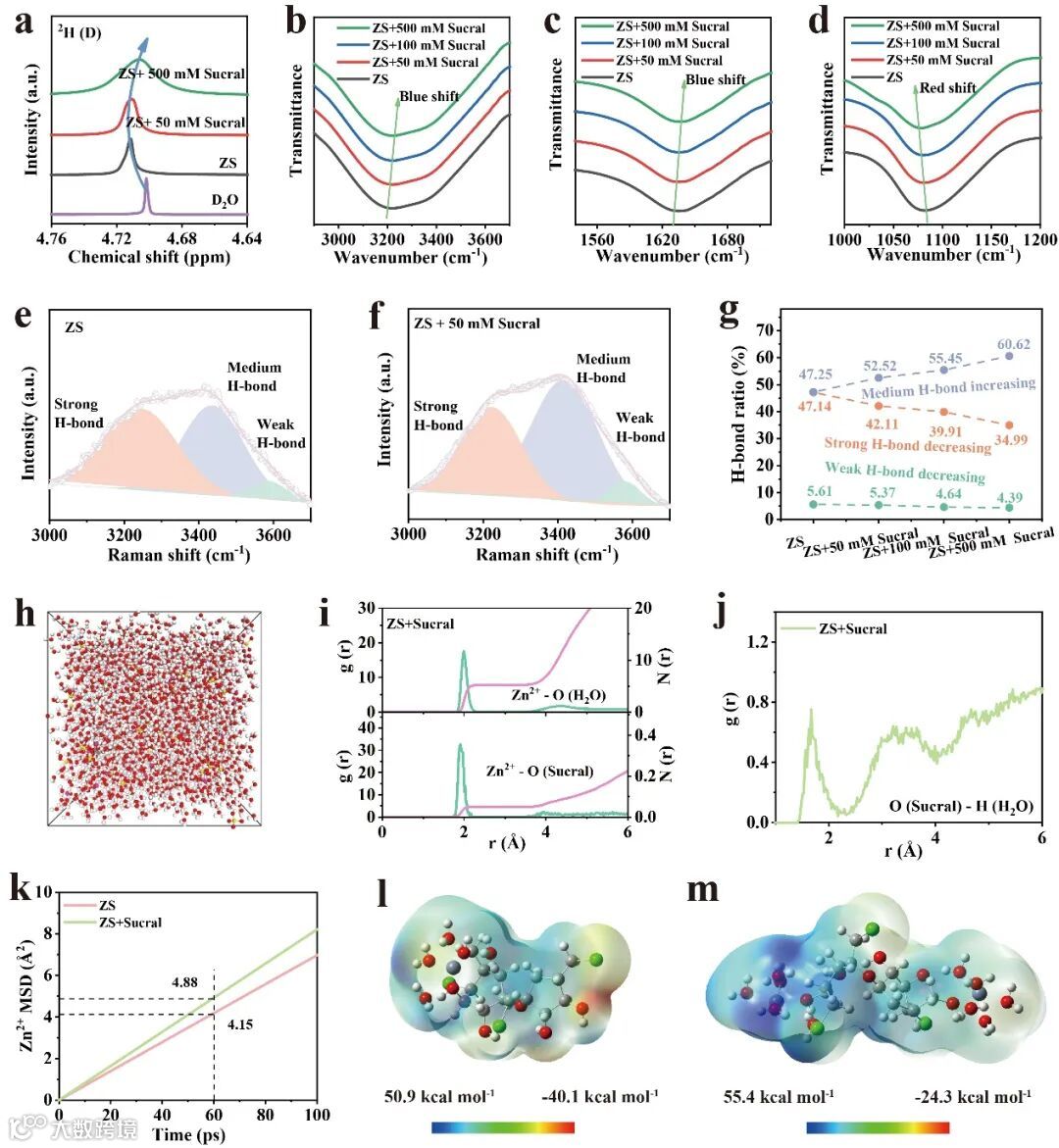 图2 a)在不同电解质中的2H NMR光谱。不同电解液的FTIR光谱:b)O-H拉伸;c)O-H弯曲;d)SO42-振动。e-f)ZS和ZS+Sucral电解质中O-H键的拉曼光谱。g)不同电解液中氢键比例的总结。h-k)ZS+Sucral电解质的分子动力学模拟结果。l-m)含有Sucral的溶剂化结构ESP图。