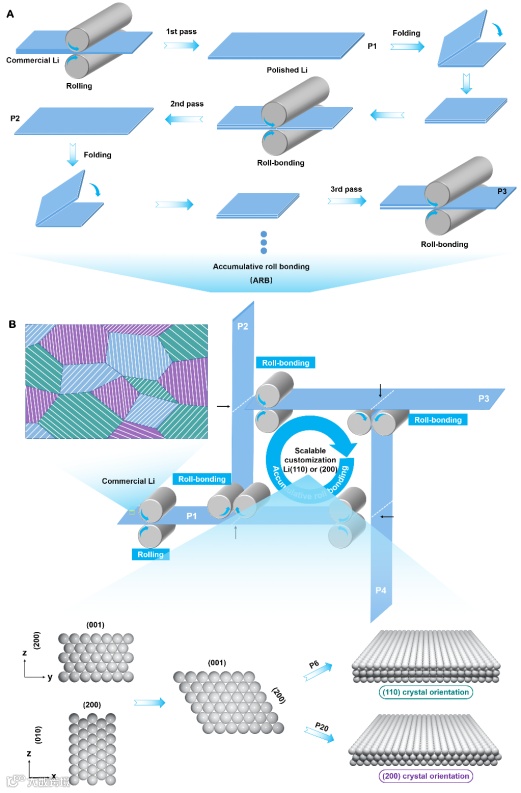近日,复旦大学的叶明新/沈剑锋教授团队,在材料领域国际顶级期刊Advanced Materials上发表题为“Scalable Customization of Crystallographic Plane Controllable Lithium Metal Anodes for Ultralong-Lasting Lithium Metal Batteries”的研究工作。作者通过调节累积滚压键合(ARB)的次数,在室温下就可以规模化定制具有(110)和(200)晶面取向的锂金属负极。研究表明,这些特定晶面的锂金属负极能够诱导锂离子均匀沉积,形成平坦致密的锂沉积物,显著提升了电池的循环稳定性。特别是,抛光Li(110)晶体平面的全电池在10C的高电流密度下展现出了10000个循环的优异稳定性,几乎没有容量衰减,这一成果为低成本、大规模生产具有高度择优取向的锂金属负极提供了重要参考,有望加速实用化锂金属电池的实际应用。