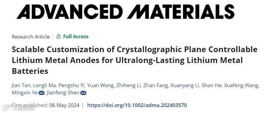 Jian Tan, Longli Ma, Pengshu Yi, Yuan Wang, Zhiheng Li, Zhan Fang, Xuanyang Li, Shan He, Xuefeng Wang, Mingxin Ye*, and Jianfeng Shen* Scalable Customization of Crystallographic Plane Controllable Lithium Metal Anodes for Ultralong-Lasting Lithium Metal Batteries.