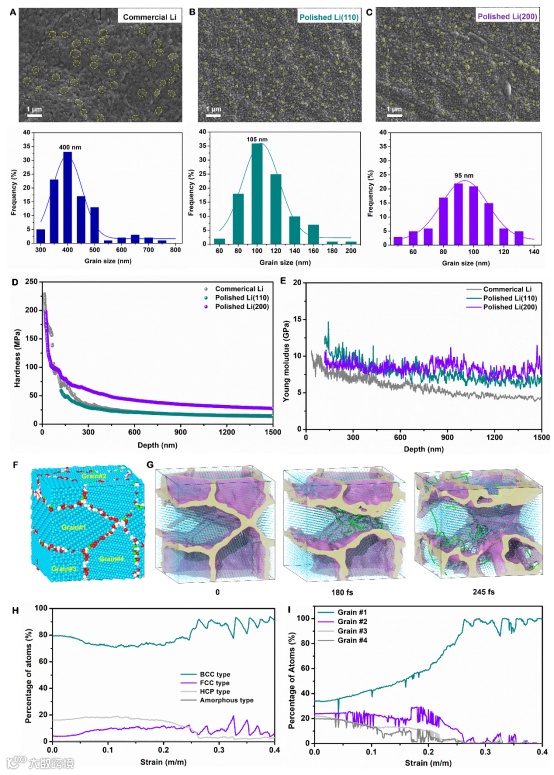 图 3. 通过扫描电子显微镜图像和纳米压痕测量,分析了商业锂金属、抛光Li(110)和Li(200)金属的微观结构和硬度变化。此外,通过分子动力学模拟,探讨了在ARB过程中锂原子的变形行为和结构转变。