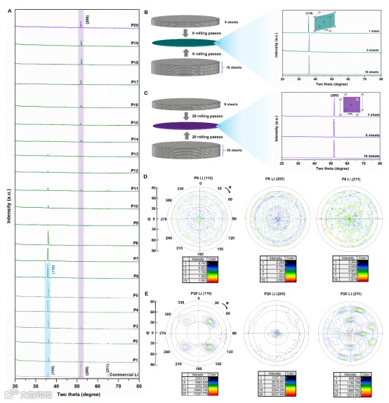 图2. 对商业锂金属和不同滚压次数下得到的抛光锂金属箔进行X射线衍射分析,证明了通过调控累积滚压键合的次数可以获得具有特定晶面取向的锂金属。