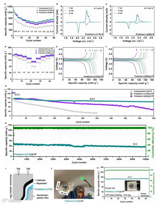 作者通过调控ARB的次数,就能够分别获得高度择优取向的(110)和(200)晶面的锂金属负极。这些具有特定晶面取向的锂金属负极在对称电池测试中展现了更低的电压滞后、更均匀的锂沉积以及卓越的循环稳定性。此外,当与硫(S)和磷酸铁锂(LFP)正极配对时,这些抛光锂金属负极表现出了优异的循环稳定性和电化学性能。特别是,抛光Li(110)金属负极在10C的高电流密度下能够稳定运行超过10000个循环,这是目前报道的最长循环寿命。这项工作不仅为制造具有高度择优晶面取向的锂金属负极提供了重要的参考,而且ARB技术与常规的卷对卷加工过程兼容,为工业规模、低成本生产锂金属箔提供了可能。通过结合稳定的人工SEI膜、优质的电解液、先进的隔膜等其他技术,有望进一步提升这些高度择优取向的锂金属箔的电化学性能,从而推动实用化锂金属电池的实际应用。