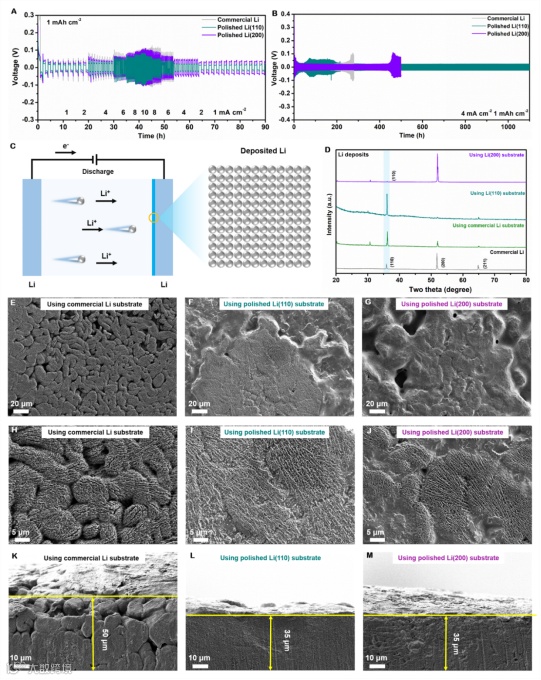 图4. Li||Li对称电池的电化学性能,包括不同电流密度下的电压曲线、Li沉积物的XRD图谱和扫描电子显微镜图像。这些结果揭示了不同基底上Li沉积物的形貌和晶体取向。