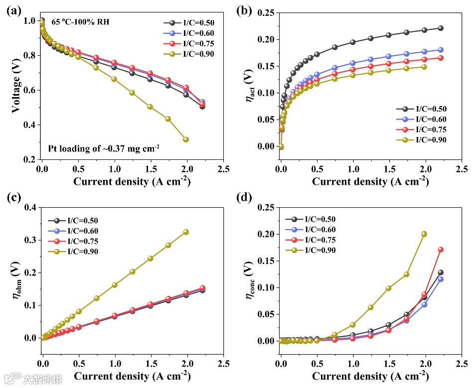 图1a为燃料电池在65 oC-100%RH工况下的极化性能曲线。结果发现,低电流密度区(<0.1 A cm-2),电池电压随I/C比的增加而增加。当电流密度超过0.1 A cm-2时,电池电压随I/C比先增大后降低,并在I/C=0.75下取得最大值。为了解析燃料电池性能和I/C比的复杂依赖关系,我们利用半经验公式法分解极化曲线,获得细致的性能参数(图1b-d):ηact、ηohm、ηconc。随着I/C比的增大,ηact逐渐降低,表明提高I/C比是促进ORR动力学反应的有效方法。对于ηohm,当I/C比在0.50-0.75范围内时,欧姆极化损失的差异可忽略不计;当I/C比增至0.90时,欧姆电阻急剧增加,可能原因是过多的离聚物覆盖在C载体表面,阻断电子传输通道,从而引入较高的电子电阻。对于任意I/C的燃料电池,ηconc随着电流密度的增加呈指数增加,并在高电密区快速增长,尤其是高I/C比体系,说明高I/C比体系更易发生严重水淹。以上性能结果表明,随着I/C变化,ηact、ηohm和ηconc存在权衡关系,最终三者在I/C=0.75获得最佳平衡,发电性能最高。