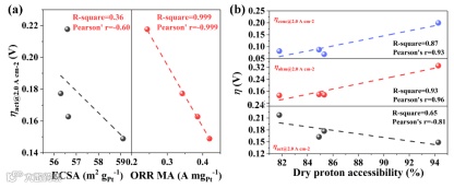 图2给出了ORR质量活性(ORR MA)、ECSA以及Dry proton accessibility与ηact、ηohm和ηconc性能参数的关系。结果发现,ORR质量活性和dry proton accessibility与ηact呈现高度负相关性,相关常数分别为-0.999和-0.81。而ECSA与ηact关联性较弱,相关参数仅有-0.60。以上结果表明ORR质量活性和dry proton accessibility是影响ηact的关键因素,而ECSA则不能作为评估动力学反应快慢的重要参数。此外,dry proton accessibility与ηohm和ηconc表现出强烈的正相关性,表明尽管提高dry proton accessibility可以有效地改善ORR动力学反应,但却对欧姆电阻和传质过程产生负面影响。因而,需要调控催化层中离聚物分布,取得最佳的dry proton accessibility,以实现ηact、ηohm、ηconc的平衡。