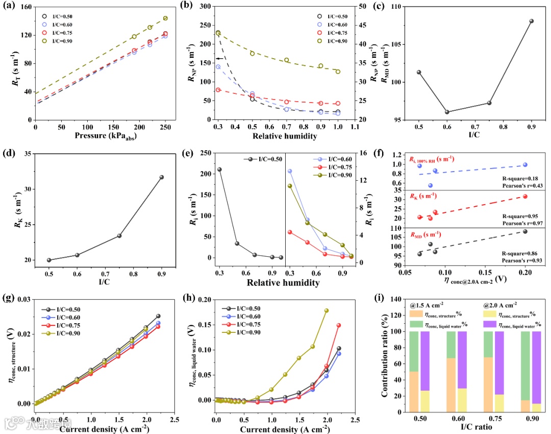 高湿条件下(≥90%RH),不同I/C体系Ri差异可忽略不计,并且Ri远小于RMD和RK。因此,高湿工况下,氧气传输阻力主要来自孔结构,而非离聚物。图3f提供的RMD、RK、 Ri与ηconc的量化关系进一步证实了高湿条件下,孔结构对氧传输的重要性。进一步地,我们解耦并量化了膜电极本征结构和液态水诱导的浓差极化损失,如图3g-h所示。结果发现,本征结构造成的浓差损失发生在整个电流密度区,而液态水淹造成的浓差损失只出现在中高电流密度区,并且I/C=0.9体系更早出现水淹。图3i给出了1.5和2.0 A cm-2处,本征结构和液态水对浓差极化损失的贡献。发现,电流密度≤1.5 A cm-2时,浓差极化损失受本征结构主导,而高电流密度区(≥2.0 A cm-2),液态水成为主导因素。