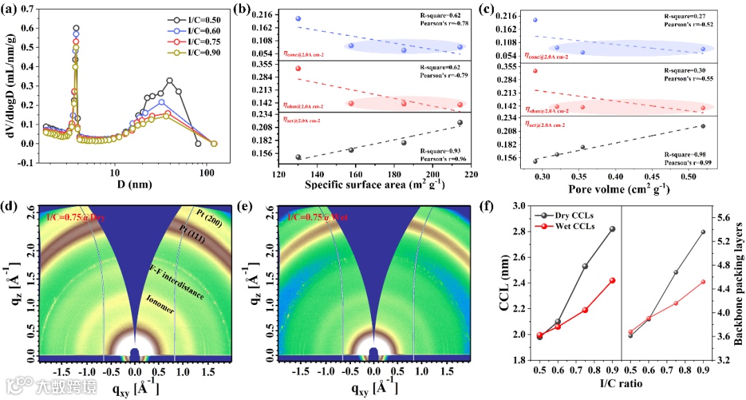 图4a为不同I/C催化层的孔径分布图。随着I/C比增加,3-4nm和10-100nm范围内的特征峰强度降低,说明两种尺度的孔结构均降低。图4b-c提供了催化层比表面积、孔体积与性能参数之间的定量关系。ηact与比表面积和孔体积高强度正相关,相关常数高达0.95以上,表明较小的孔结构有利于加快ORR电化学反应。相反,ηohm、ηconc与比表面积和孔体积则呈现较弱的负相关性,表明较大的孔径和较高的孔隙率有利于电子和氧气传输,但权重因子较低。值得注意的是,当比表面积和孔体积处于适当范围内(浅粉色和浅紫色区),孔结构变化对ηohm和ηconc的影响可忽略不计。然而,当孔结构过少时,ηohm和ηconc显著增加。这个信息很重要,它为我们提供了一个灵活区域,可在大范围内控制形态和性能,以实现ηact和ηohm、ηconc的平衡。