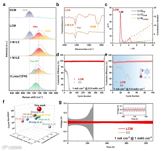 图2(a)纯离子液体、1 M ILE、2 M ILE、LCM和纯DCM的拉曼谱图。(b)LCM和2 M ILE的FT-IR谱图。(c)LCM的径向分布函数。(d)不同电解液组装的Li/Cu电池在1 mA cm-2,0.5 mAh cm-2条件下的循环性能。(e)不同电解液组装的Li/Cu电池在-10 °C,1 mA cm-2,0.5 mAh cm-2条件下的循环性能。(f)锂铜循环性能与近期报道工作对比。(g)不同电解液组装的Li/Li电池在1 mA cm-2,1 mAh cm-2条件下的循环性能。