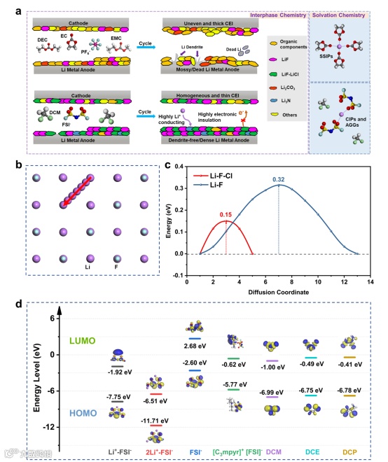 图1(a)BE和LCM的SEI/CEI的组分以及对应的溶剂化结构示意图。(b)锂离子迁移路径示意图。(c)锂离子在LiF和LiF-LiCl晶界迁移的扩散能垒对比图。(d)通过DFT计算得到的Li+-FSI-,2Li+-FSI-,FSI-,C3mpyrFSI,DCM,DCE和DCP的LUMO和HOMO能级图。