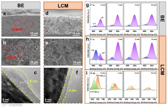 图4 BE和LCM体系LCO电池循环50圈后LCO的SEM形貌表征,其中(a,d)为截面,(b,e)为表面。循环后LCO颗粒的HRTEM图像,其中(c)为BE,(f)为LCM。BE和LCM体系CEI的XPS图谱,其中(g,h)为F 1s,(i)为Cl 2p。