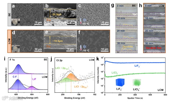 图3 在不同温度下BE和LCM体系的镀锂铜箔的SEM图像,其中(a,d)为室温沉积表面,(b,e)为室温沉积截面,(c,f)为-10 °C沉积表面。锂沉积的原位观察显微镜图像,其中(g)为BE,(h)为LCM。XPS图谱,其中(i)为F 1s,(j)为Cl 2p。(k)用TOF-SIMS表征LCM中LiF2-和LiCl2-的强度溅射分布及其三维重建分布图。